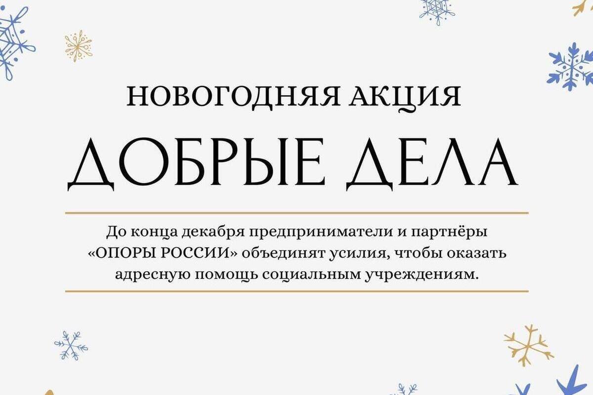 С ноября и до конца декабря предприниматели и партнёры «Опоры России» объединят усилия, чтобы оказать адресную помощь детским домам, приютам, домам престарелых, реабилитационным центрам. Речь не идет о сборе денег. Каждый желающий может присоединиться, предоставив товары, продукцию или полезные вещи — от предметов первой необходимости и средств гигиены до продуктов, книг, игрушек, одежды и оборудования.