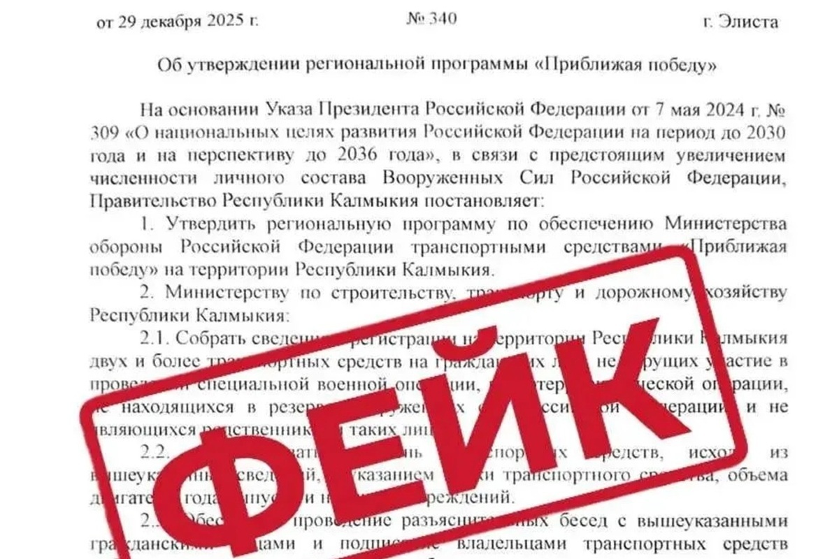 В социальных сетях распространяется поддельное постановление правительства Калмыкии о передаче транспортных средств в пользу регионального министерства строительства.