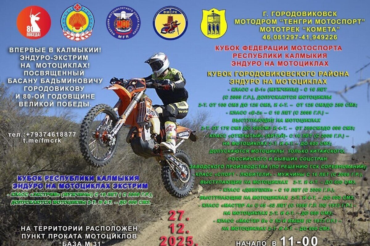 27 декабря здесь впервые состоится захватывающий турнир по эндуро‑экстриму. Соревнования, посвящённые памяти Басана Бадьминовича Городовикова и 80‑летию Великой Победы, соберут гонщиков из Ростова‑на‑Дону, Краснодара, Северной Осетии — Алании, Ставрополя и других городов.