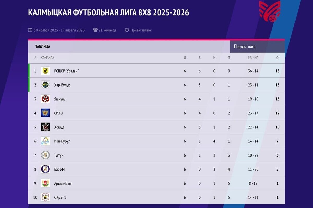 Сегодня прошли первые в наступившем году игры Калмыцкой футбольной лиги. Завершен шестой тур.